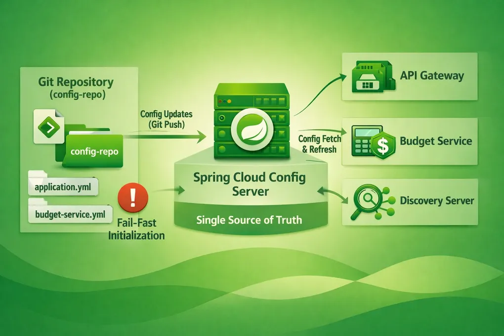With 10+ microservices, each needing database URLs, Eureka endpoints, JWT secrets, and Kafka bootstrap servers — and all of those varying per environment — hardcoding properties doesn’t scale. PFMS uses Spring Cloud Config Server to centralize everything in a Git repository. Change a property, push to Git, and services pick it up without restarting.